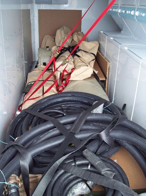 Six Stackable Washer/Dryer Combination Systems with pumps, hoses, and TEMPER Tent extension off of end wall